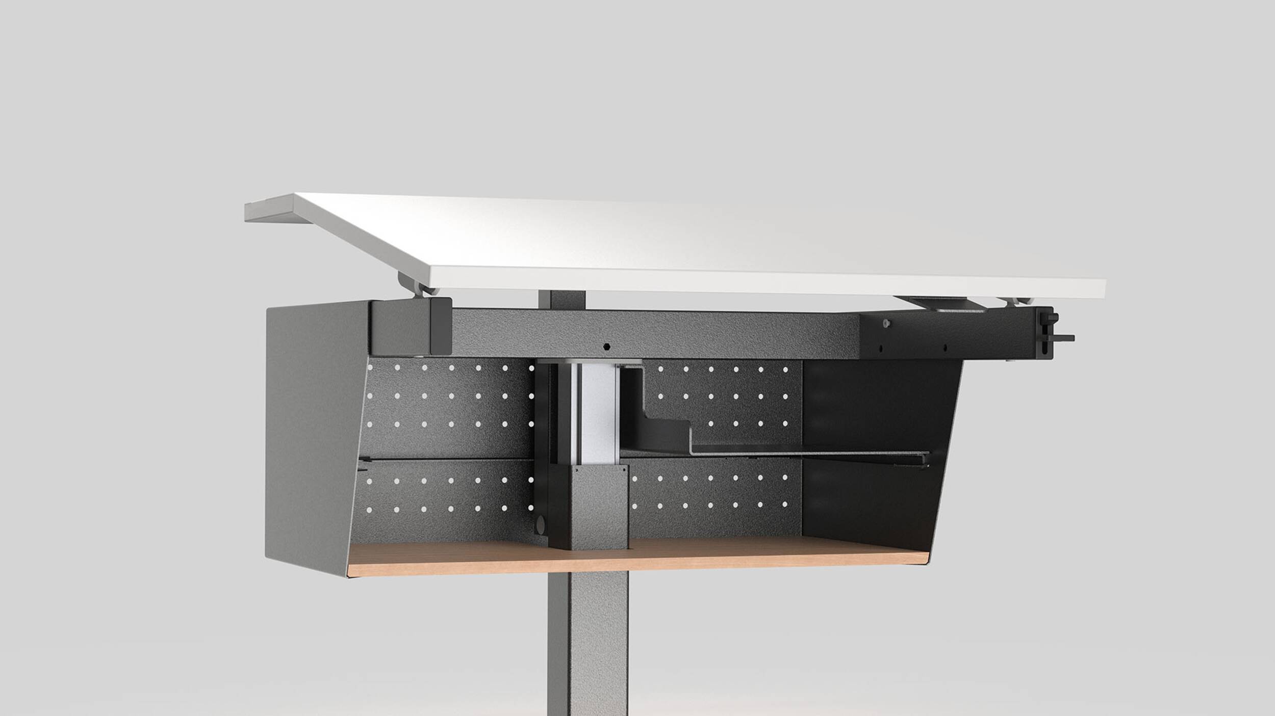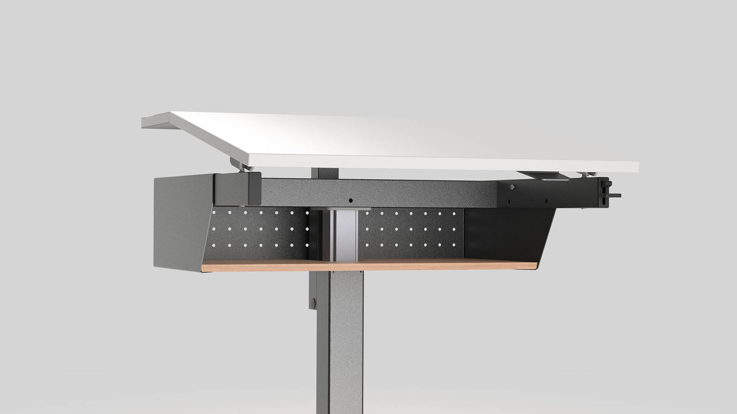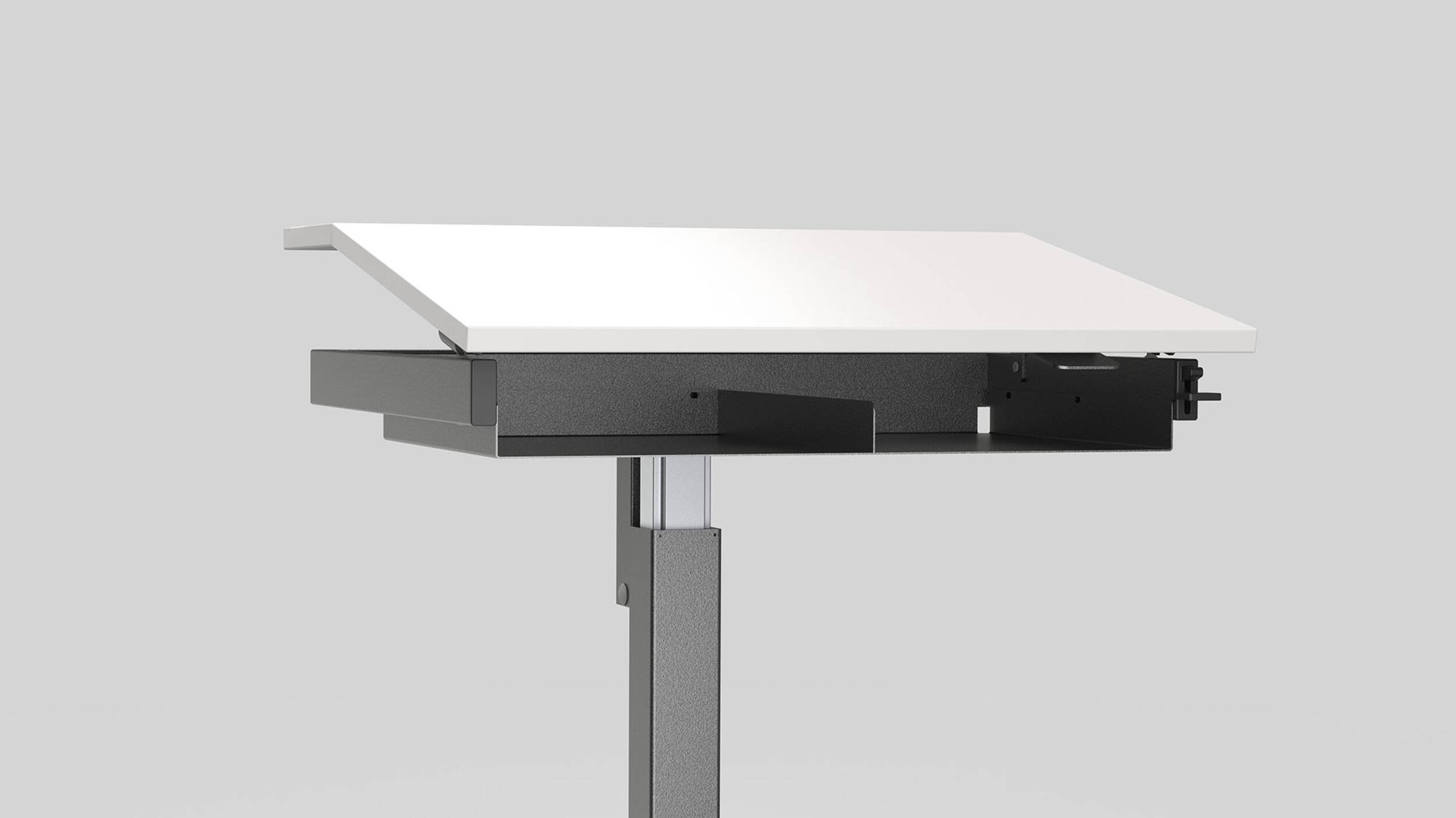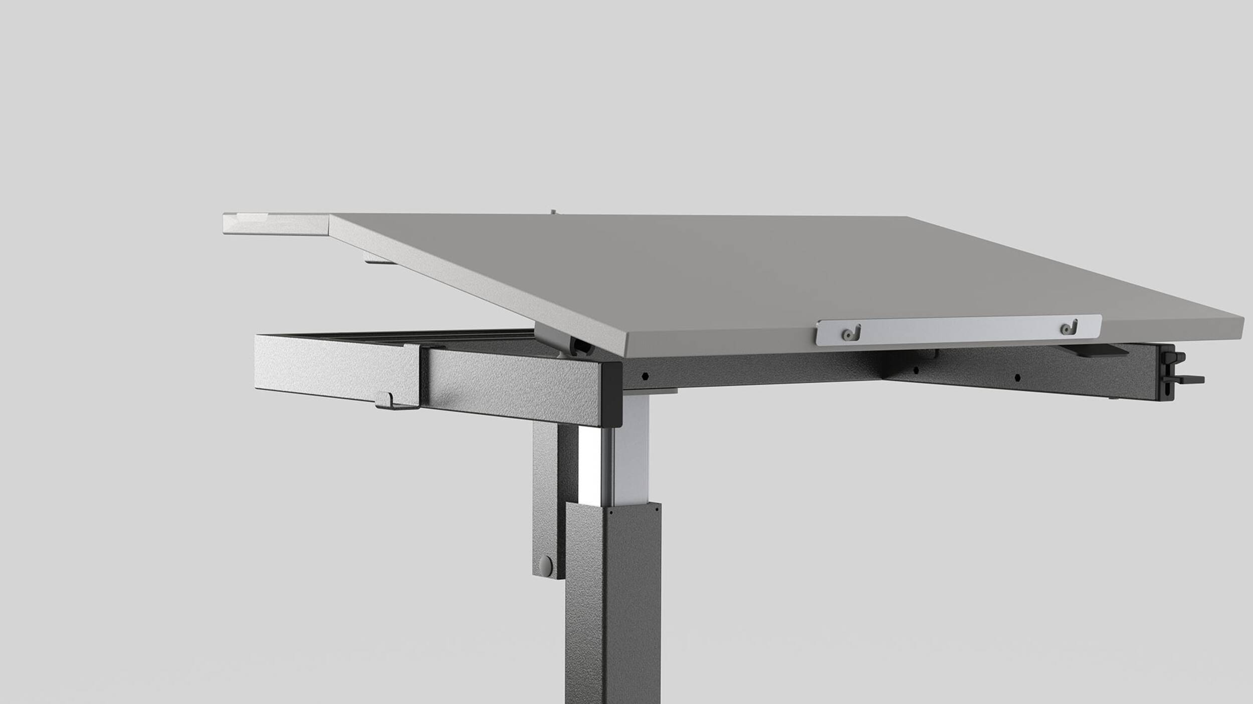 Tischblatt zweiteilig neigbar bis 16° mit Gaslift.