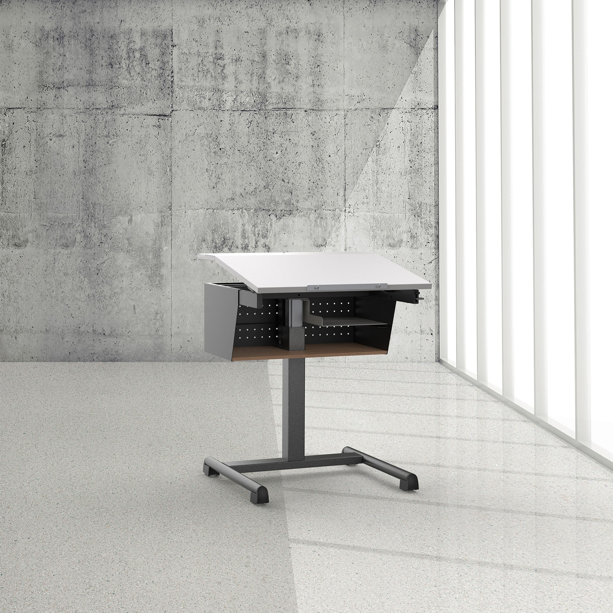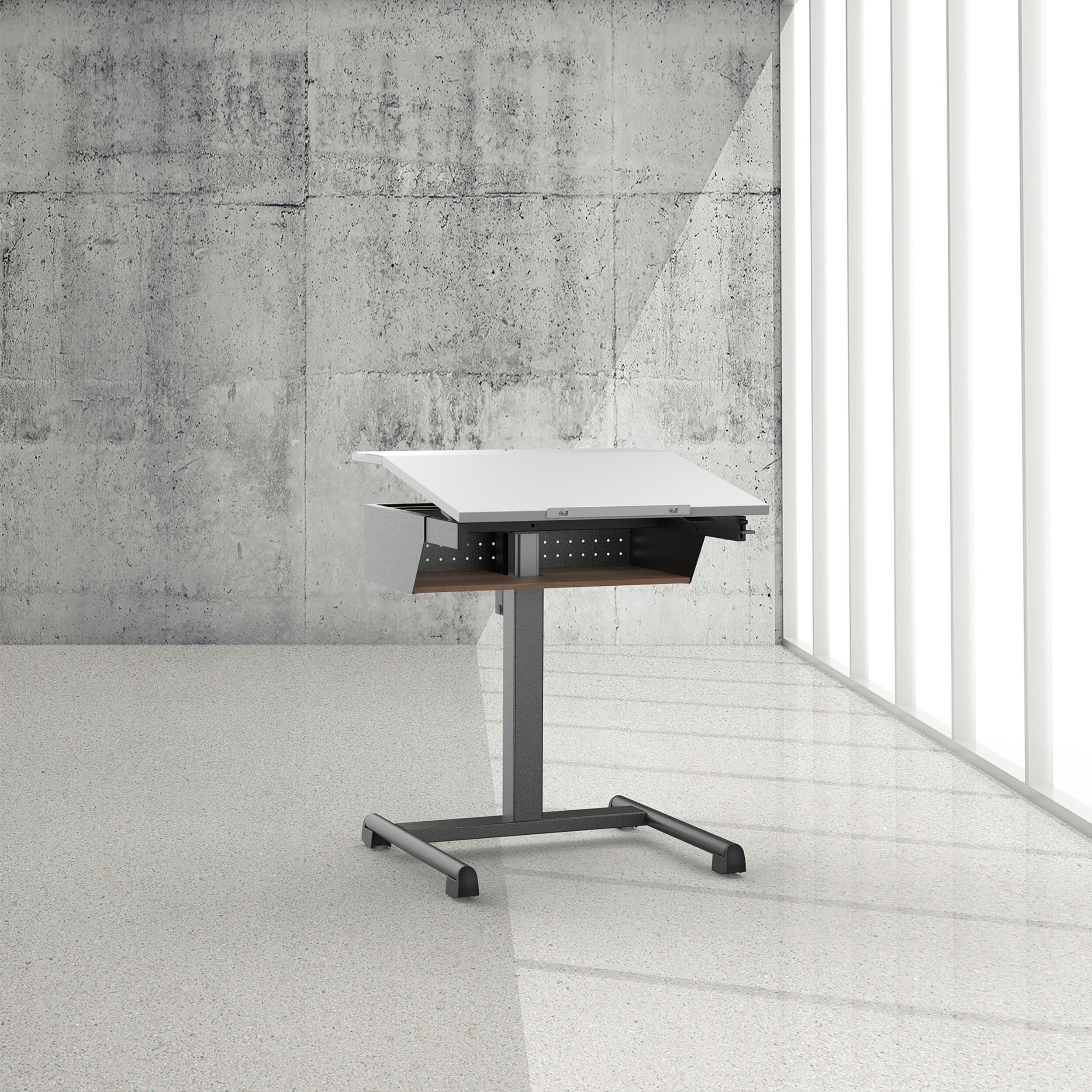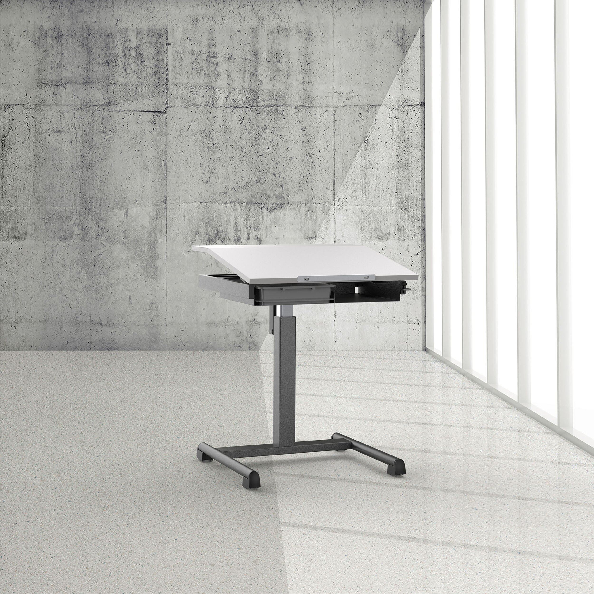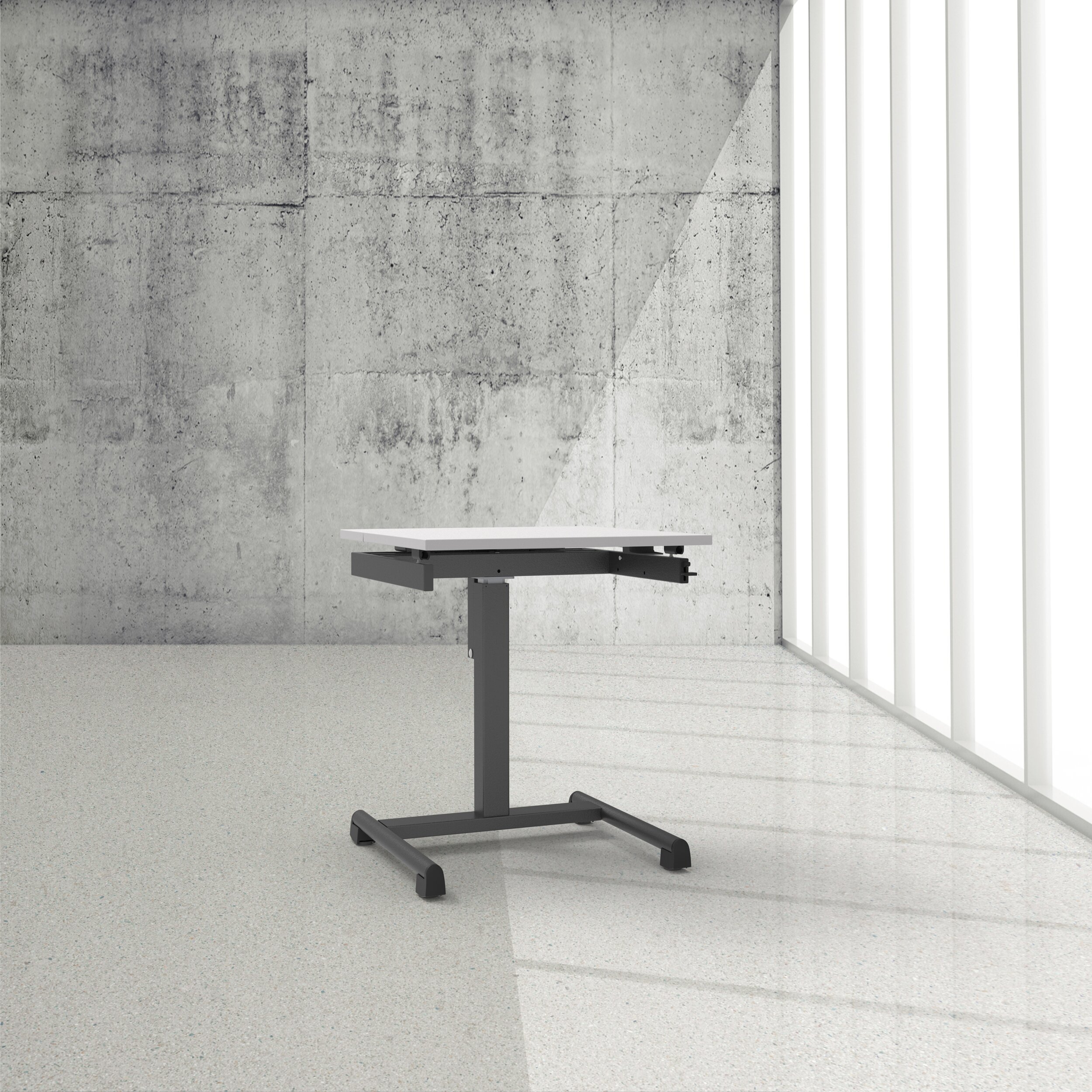 In zwei der vier Nivellierfüsse sind Rollen integriert. Der Flexo Tisch lässt sich so durch leichtes Anheben an der vorderen Tischkante einfach umplatzieren. Die rückver- setzte Quertraverse bietet maximale Beinfreiheit, ohne die Stabilität zu beeinträchtigen.