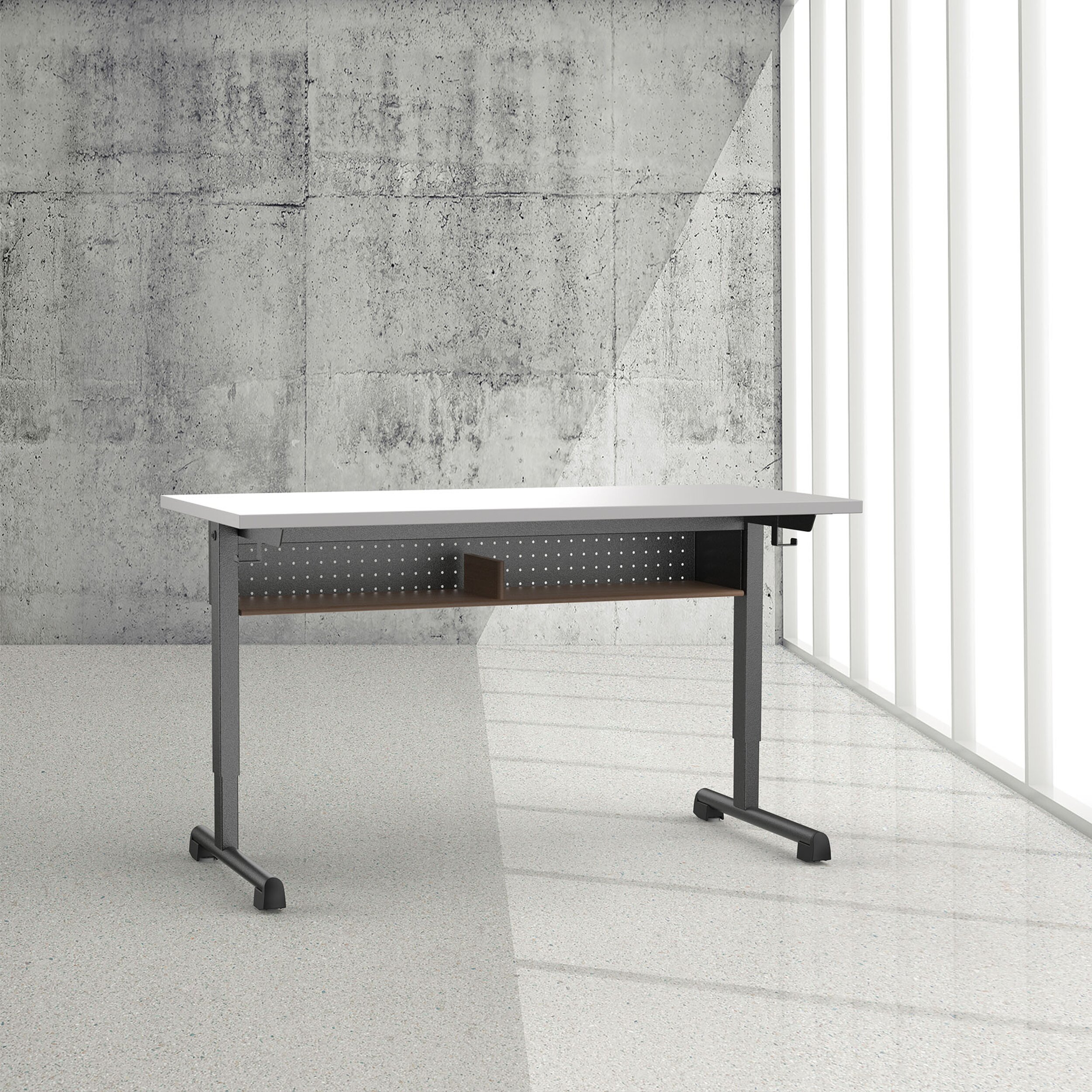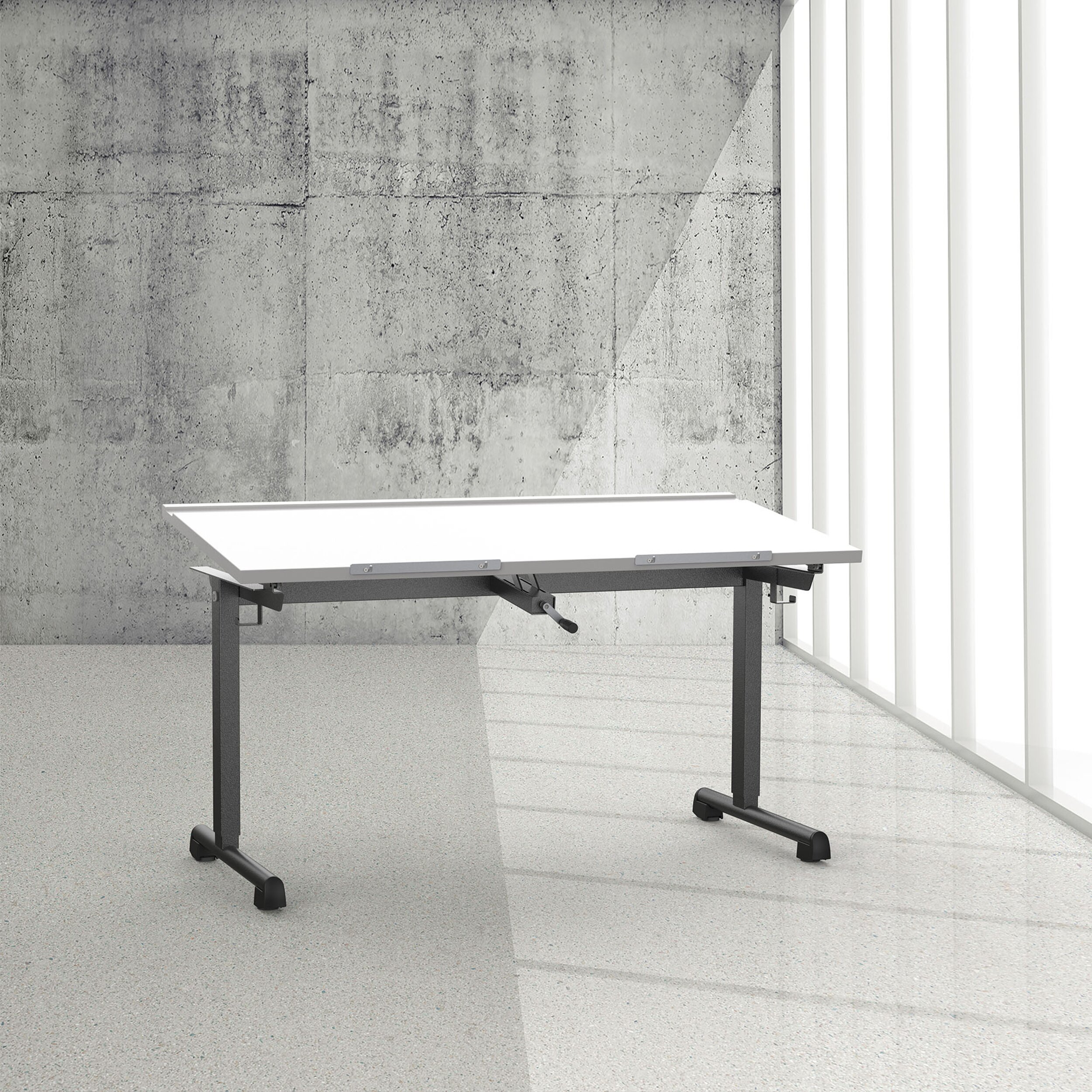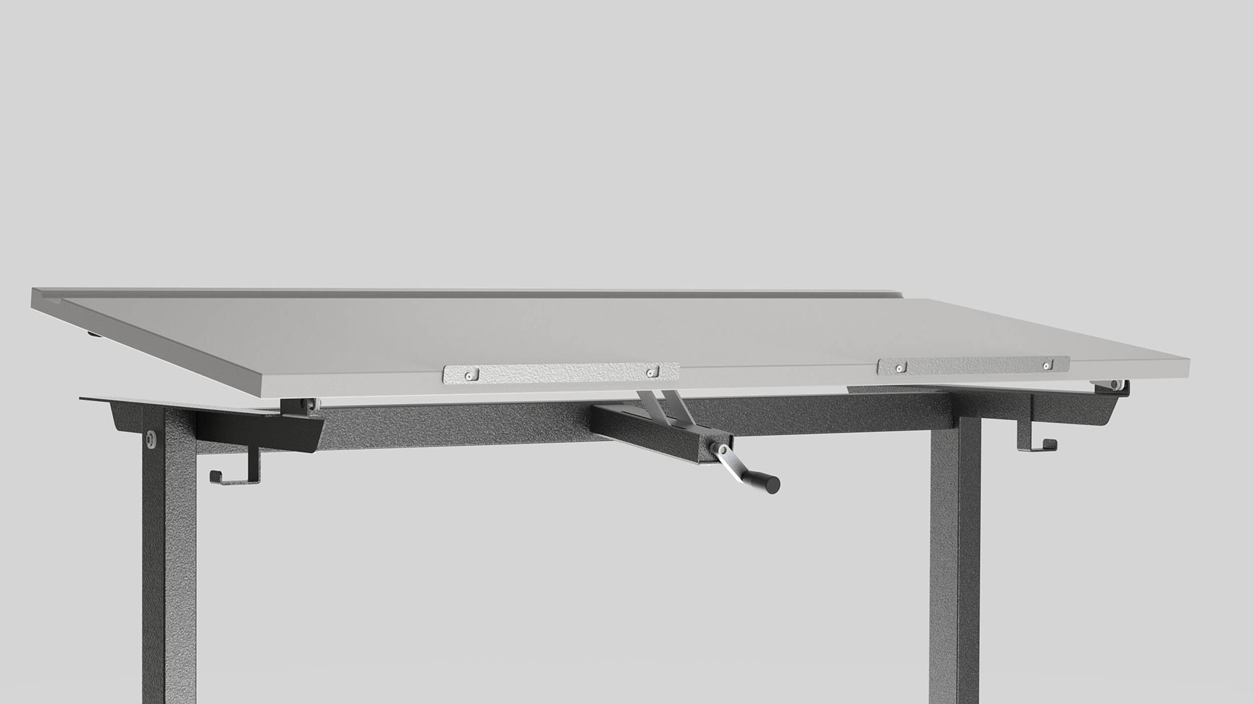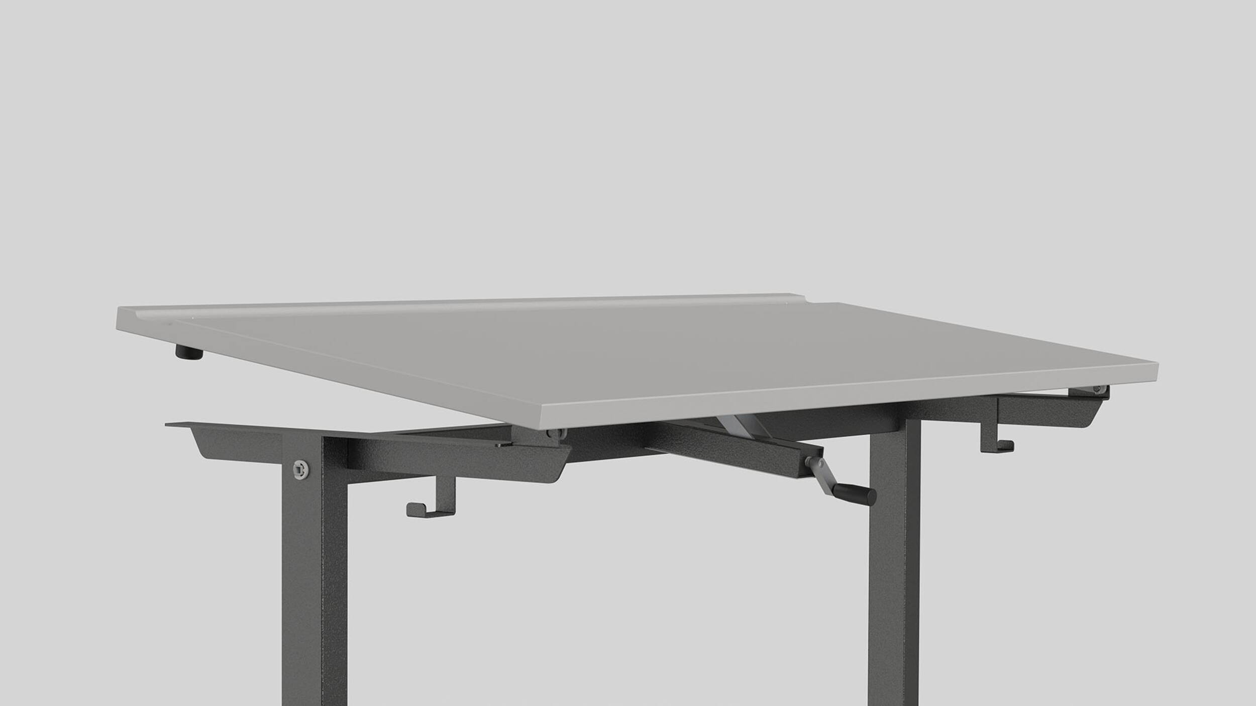 Einfache Bedienung seitlich vom Tischblatt für die leicht- gängige Höhenverstellung mit Kurbel.