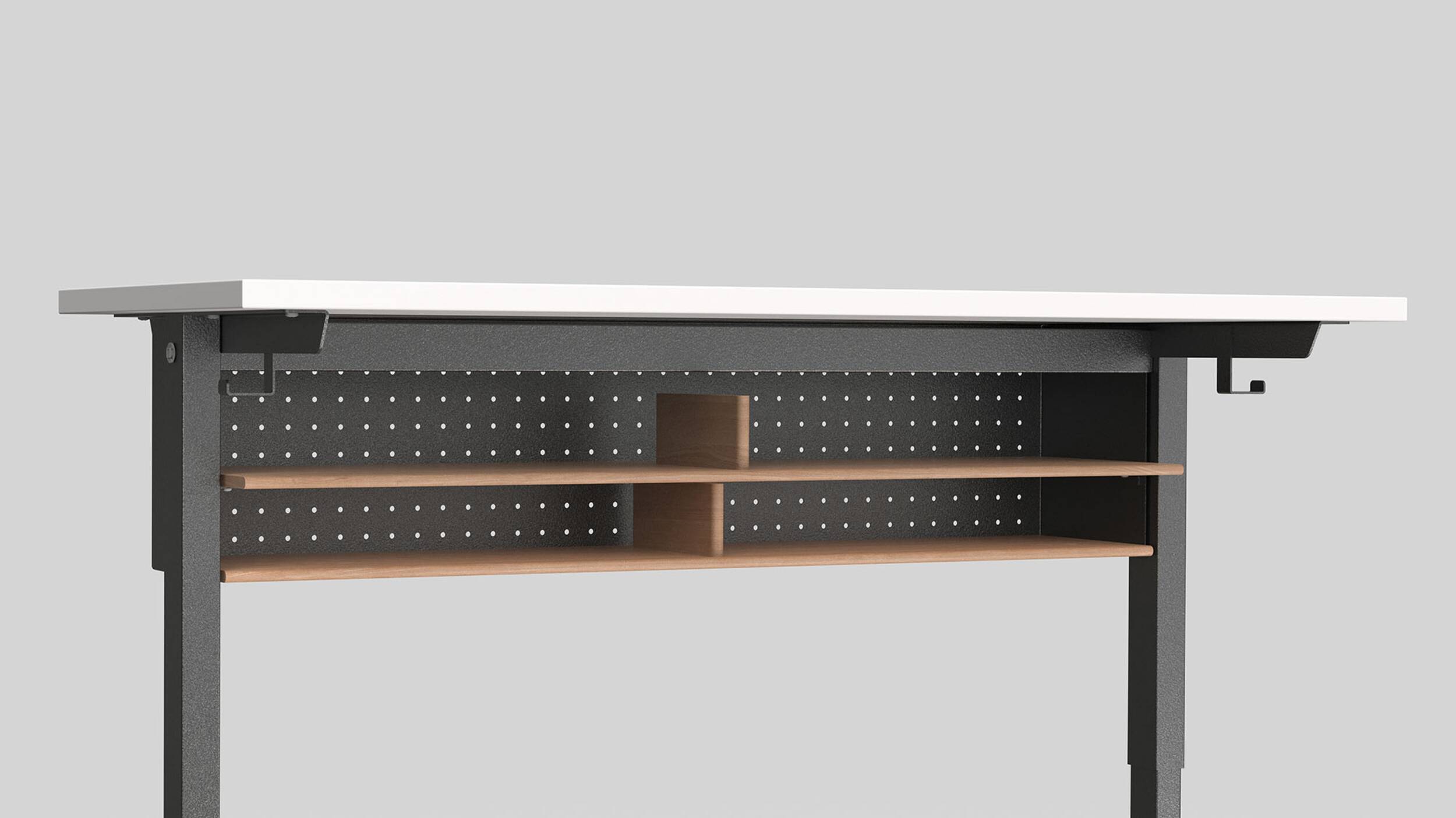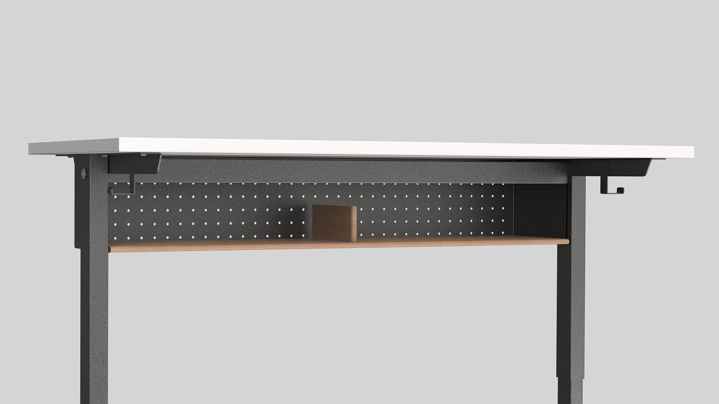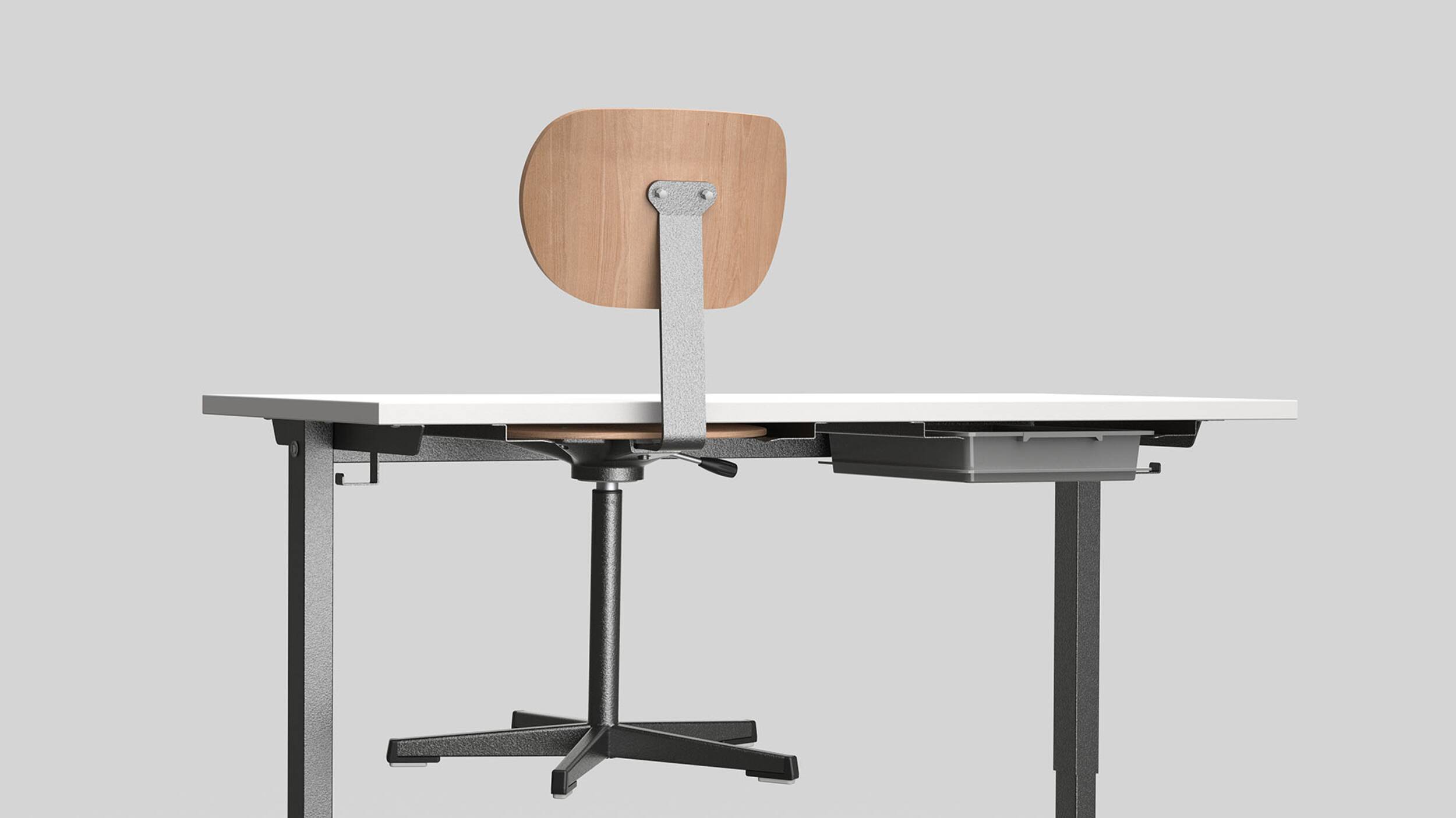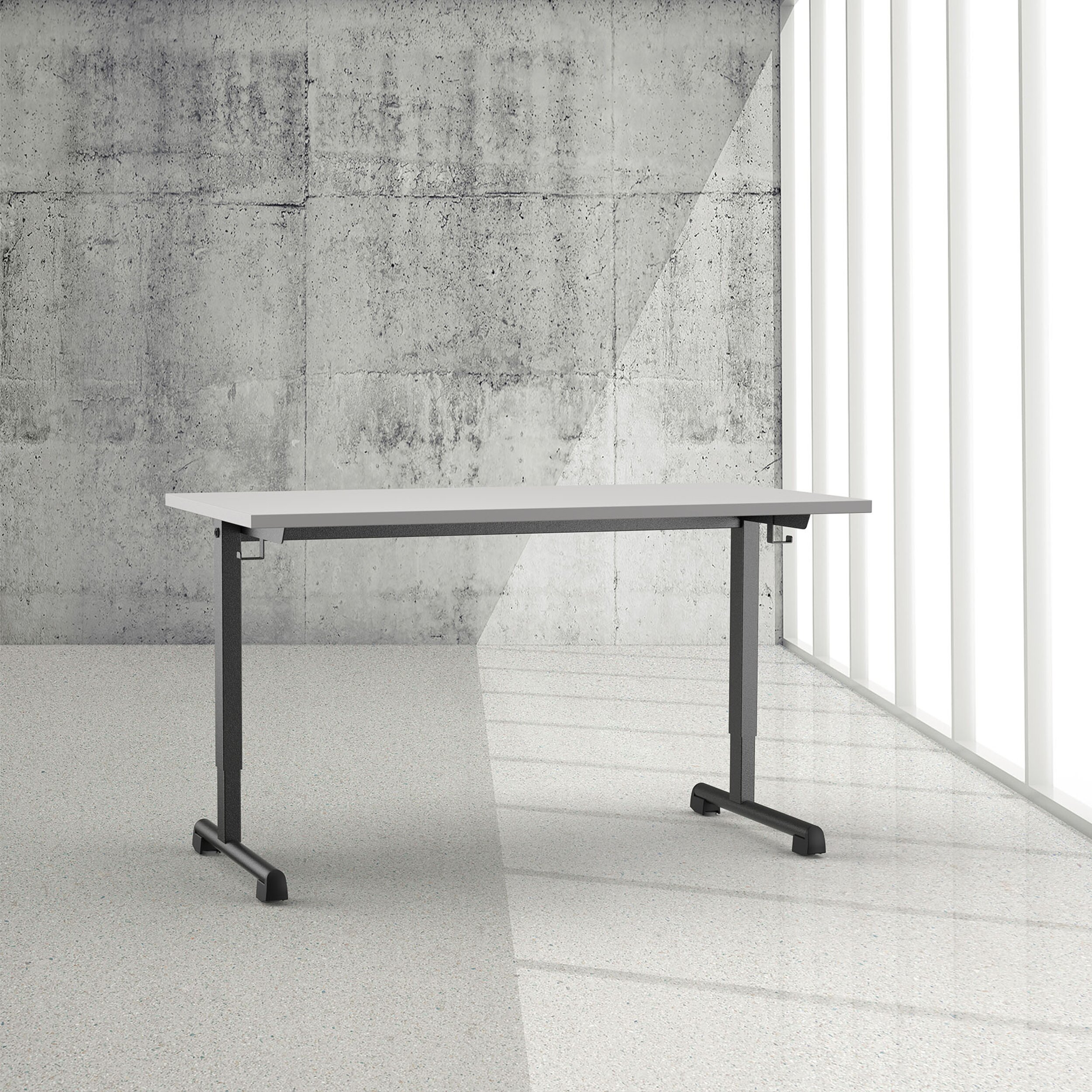 In zwei der vier Nivellierfüsse sind Rollen integriert. Der Meta Tisch lässt sich so durch leichtes Anheben an der vorderen Tischkante einfach umplatzieren.