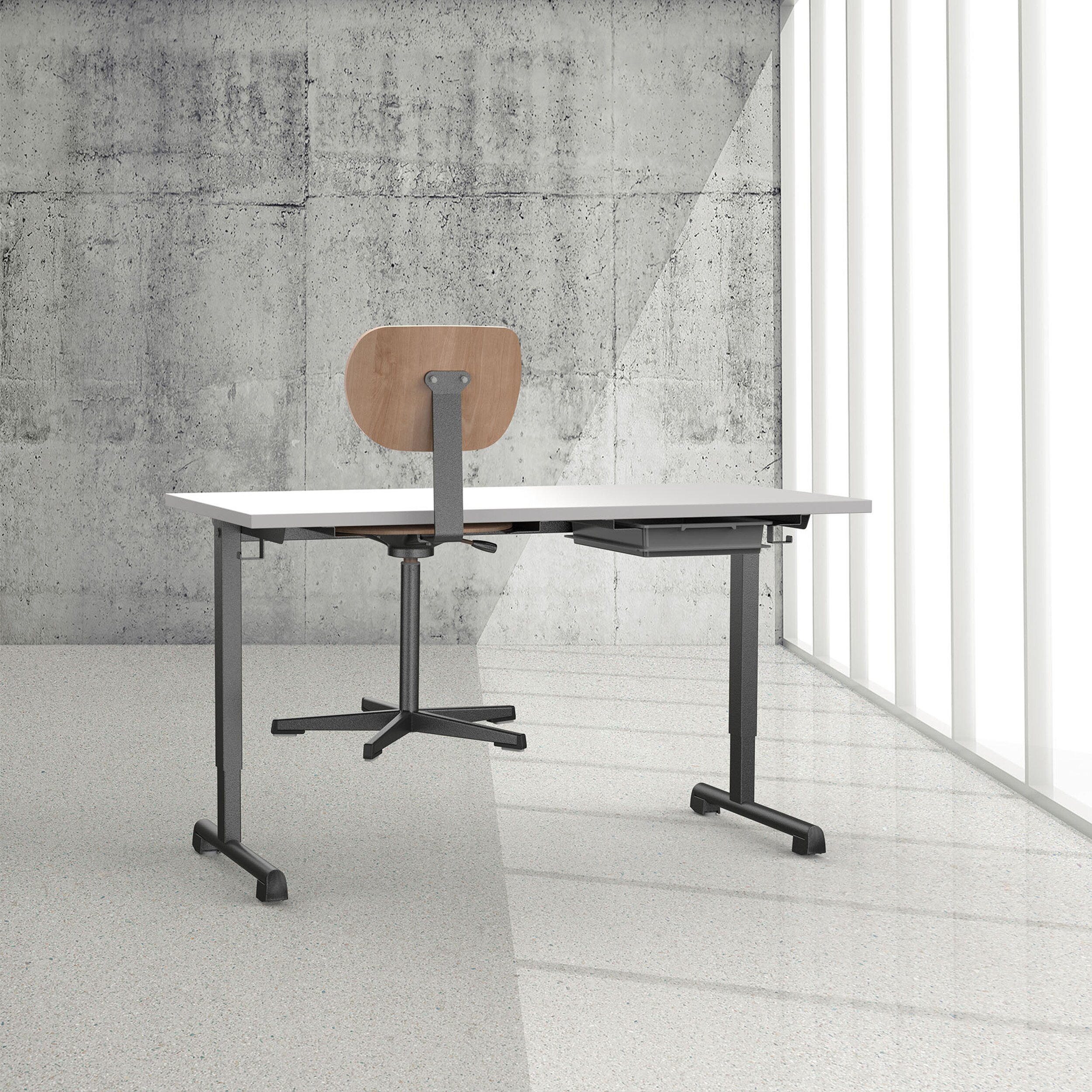 Das META Lernmobiliar umfasst sehr solide Arbeitstische in Einzel- oder Doppelplatz-Ausführung. Das Tisch-blatt ist in verschiedenen Formaten und Ausführungen erhältlich. Alle Teile sind verschleissfest, pflege-leicht und wartungsfrei. Das Gestell in klassischer T-Form aus Präzisionsstahl ist pulverbeschichtet. Ohne Traverse für optimale Beinfreiheit und einfache Bodenreinigung. In zwei der vier Nivellierfüsse sind Rollen integriert für einfaches Umplatzieren.