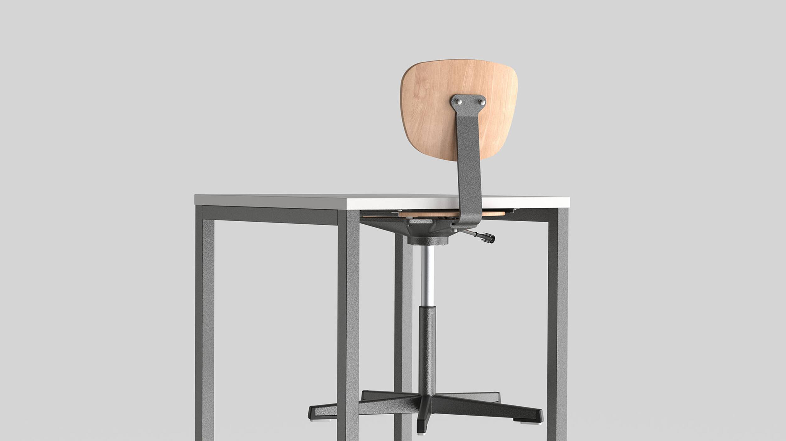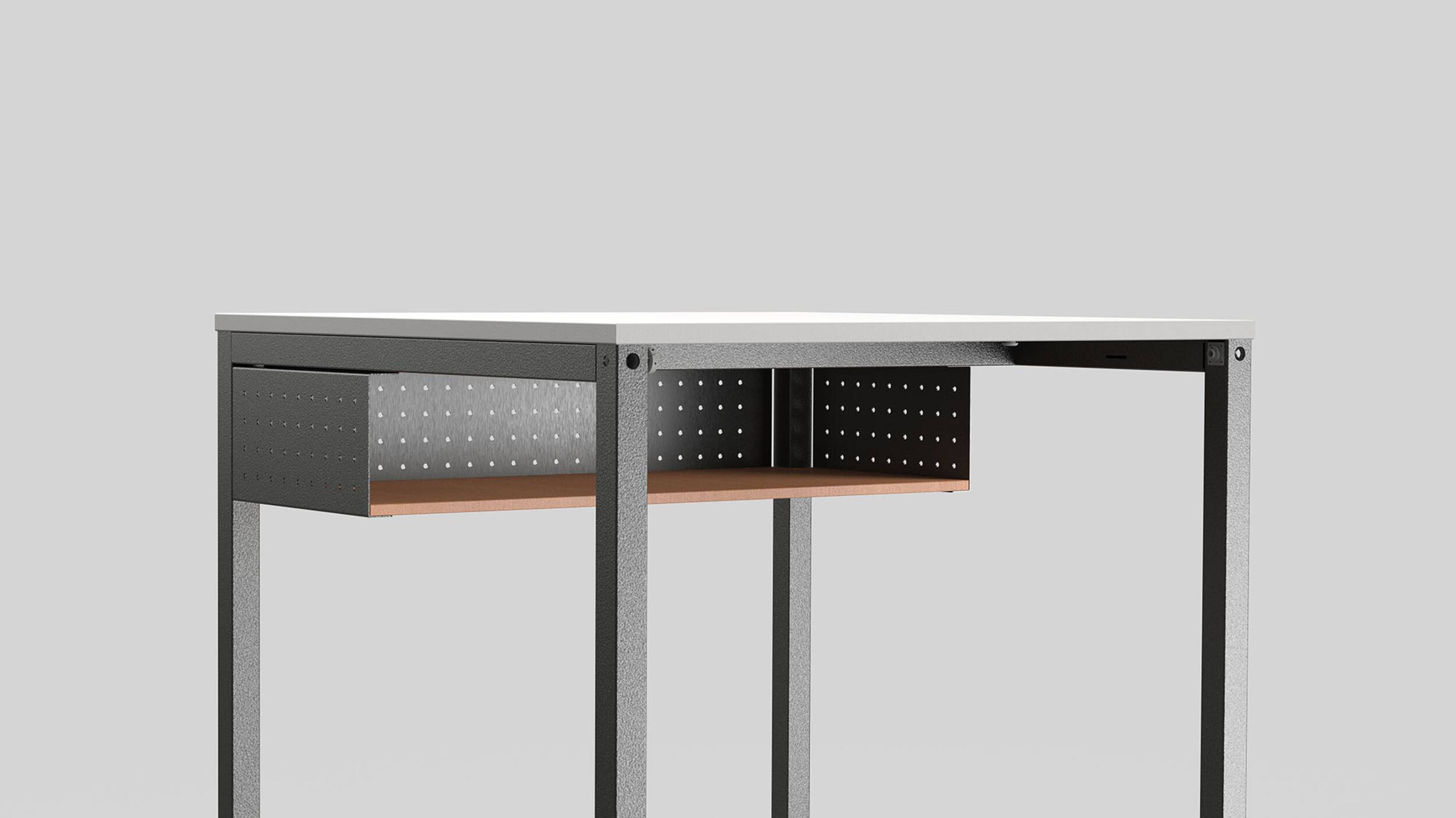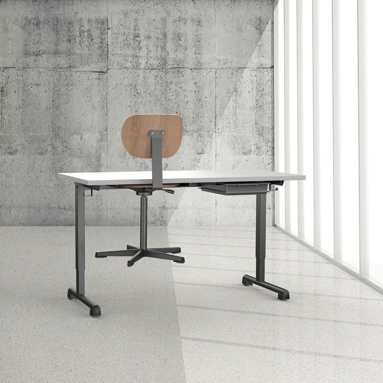 Die Tischkonstruktion besteht aus absolut verwindungs-steifem Präzisionsstahlrohr. Die schülerseitige Zarge ist zu-rückversetzt.