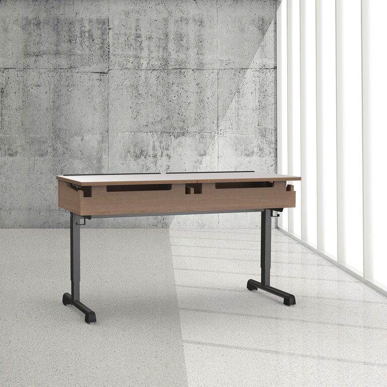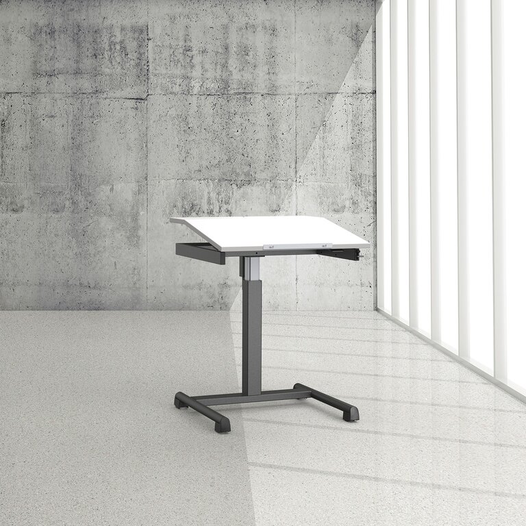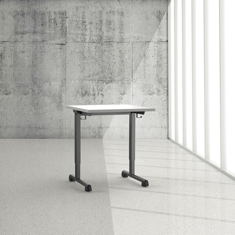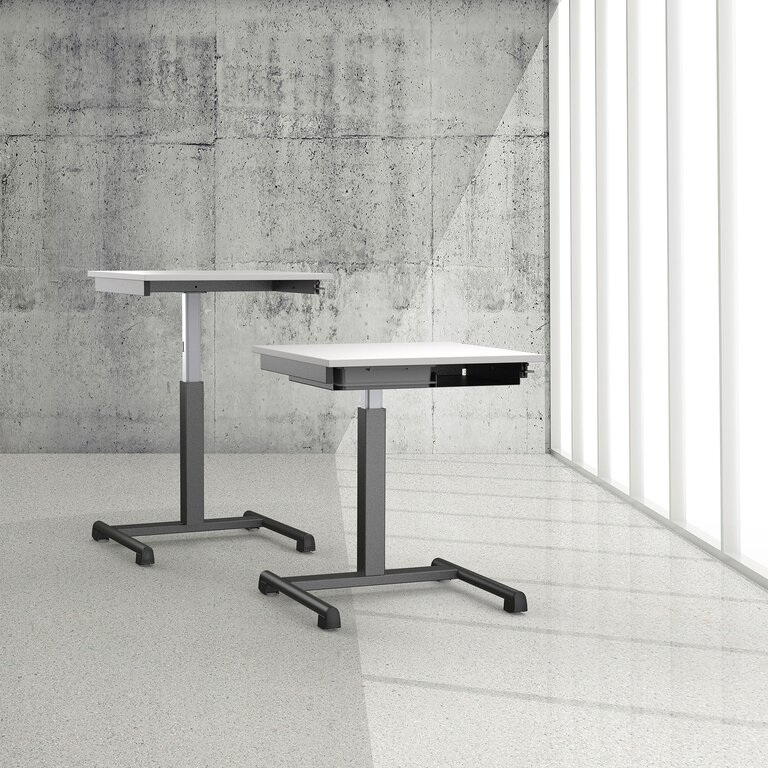 In zwei der vier Nivellierfüsse sind Rollen integriert. Der Quattro Tisch lässt sich so durch leichtes Anheben an der vorderen Tischkante einfach umplatzieren