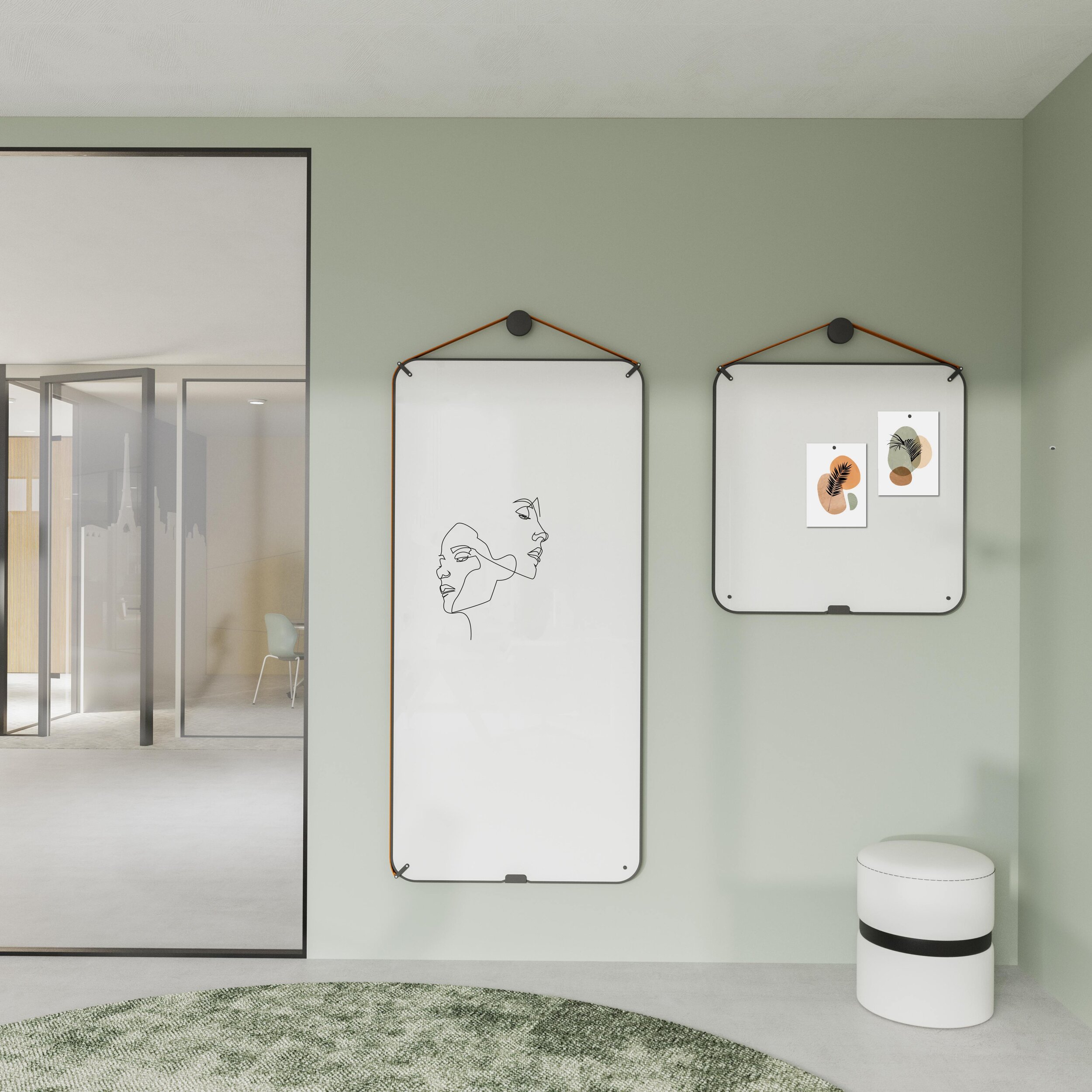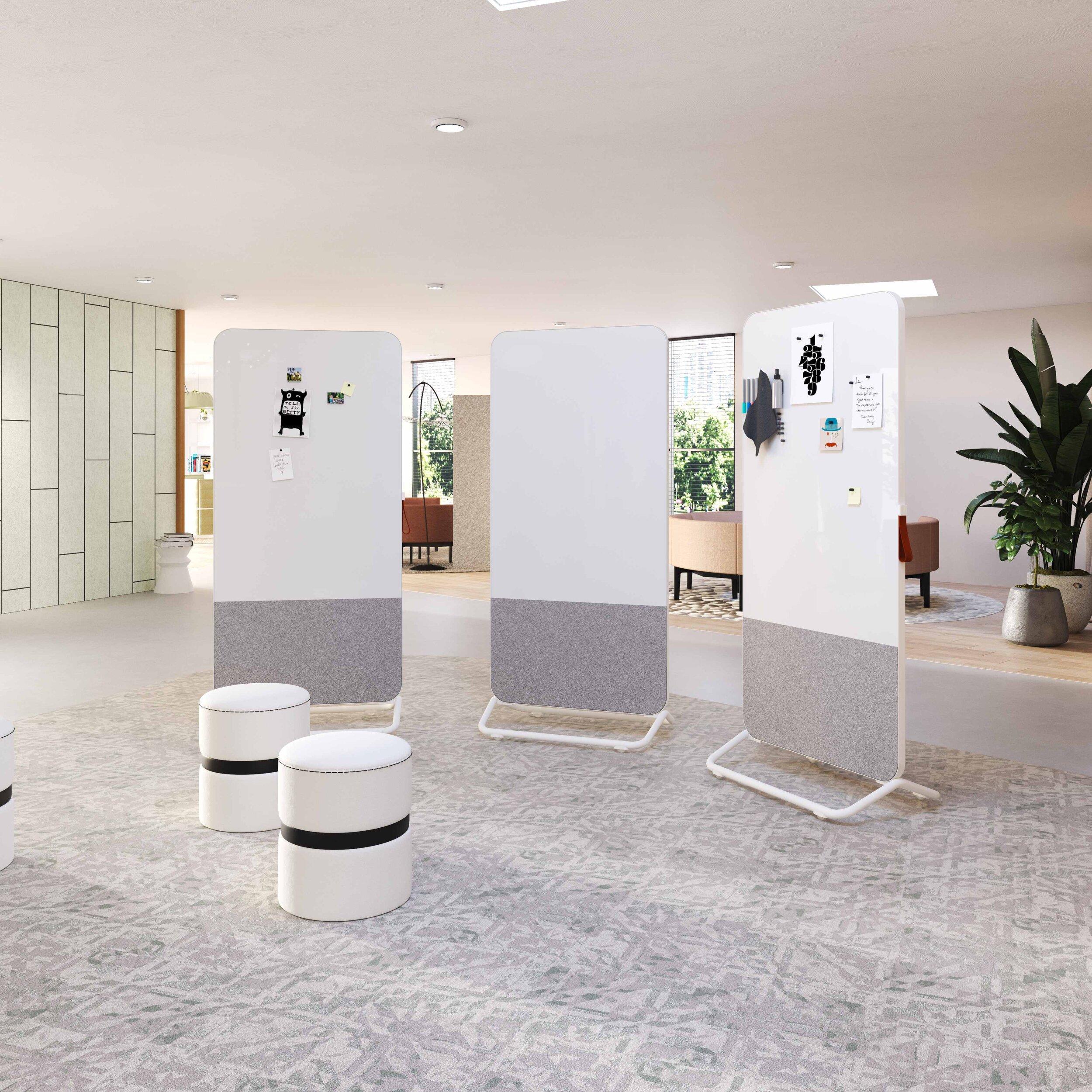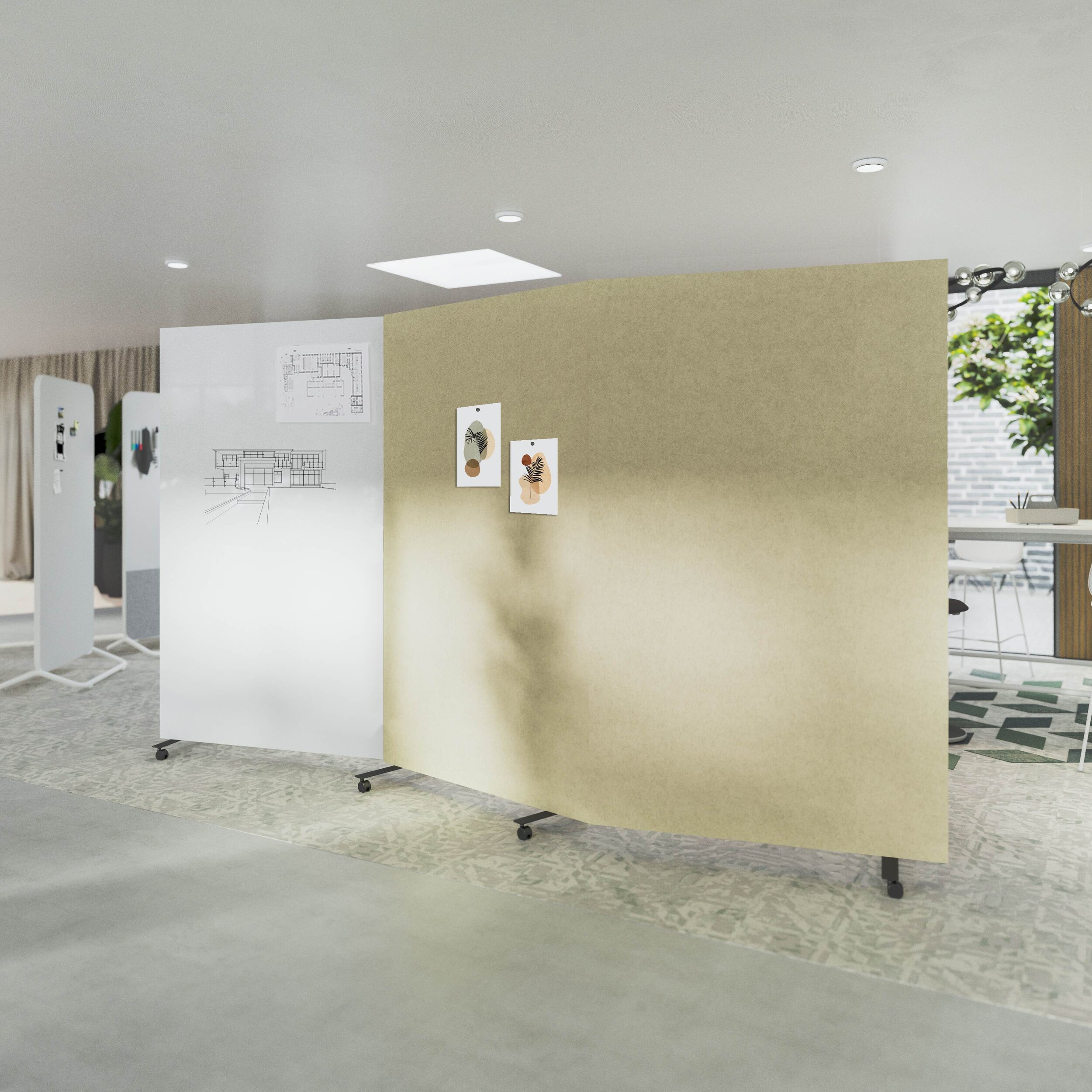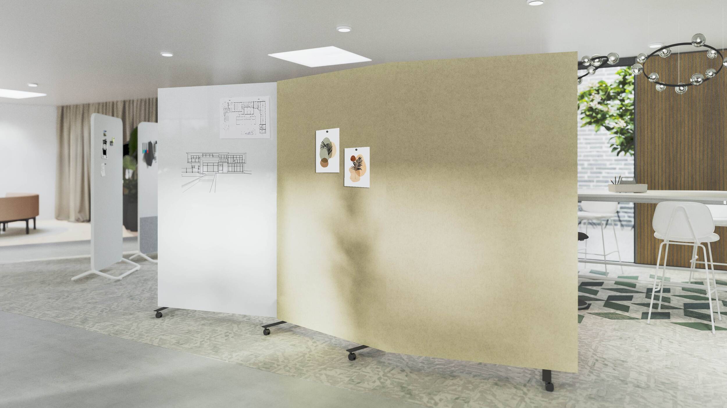 Die Gruppe besteht aus Elementen mit der Möglichkeit, die Materialien auch in mobilen und tragbaren Produkten zu verwenden. Ob Whiteboard, Glas- oder Akustikoberfläche, die Einteilung ist beidseitig in unterschiedlicher Ausführung möglich.