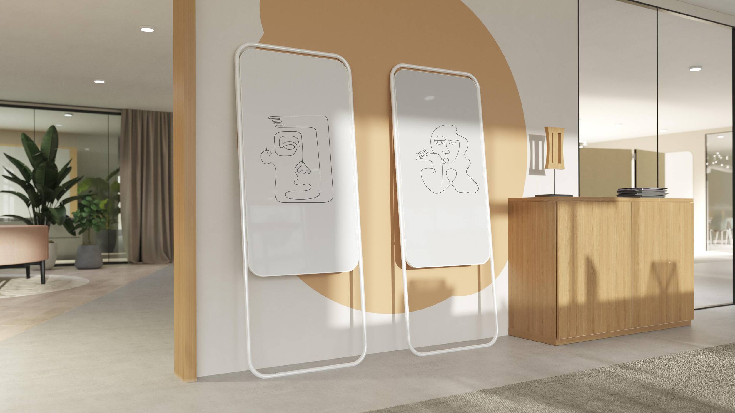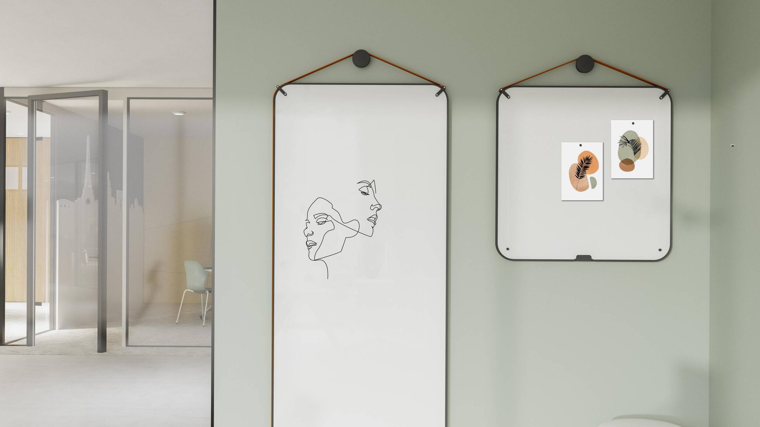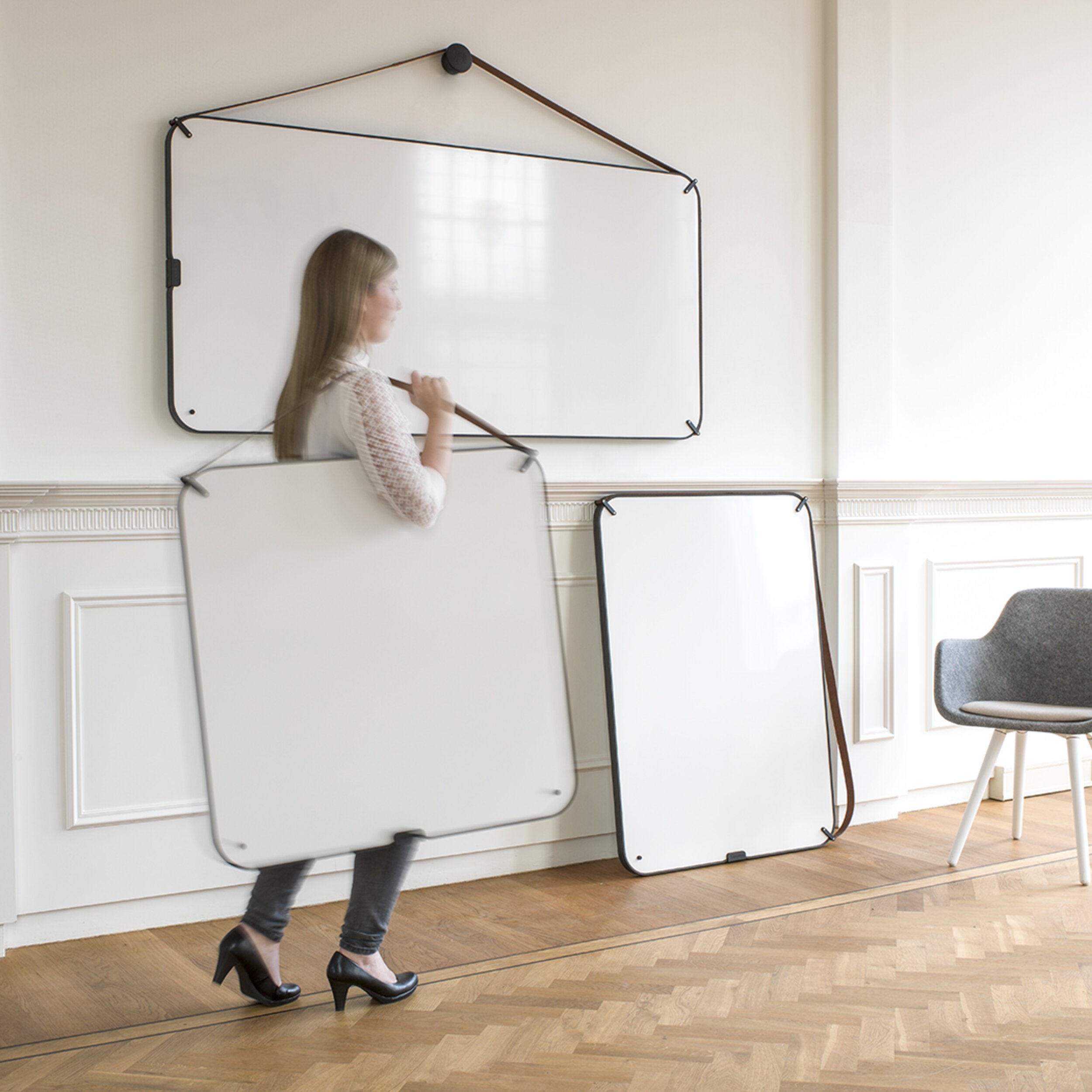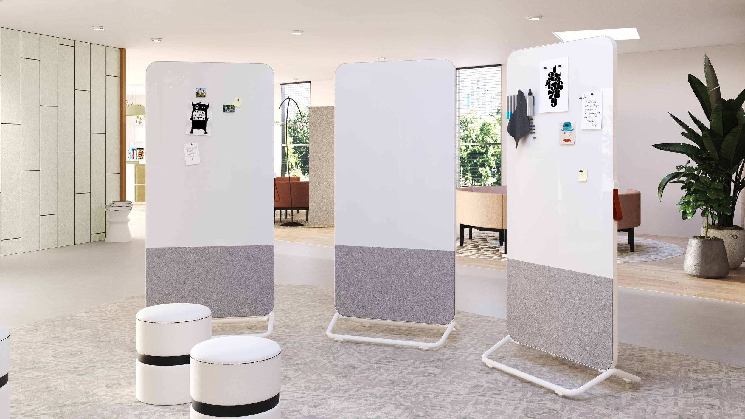 Die Gruppe besteht aus Elementen mit der Möglichkeit, die Materialien auch in mobilen und tragbaren Produkten zu verwenden. Ob Whiteboard, Glas- oder Akustikoberfläche, die Einteilung ist beidseitig in unterschiedlicher Ausführung möglich.