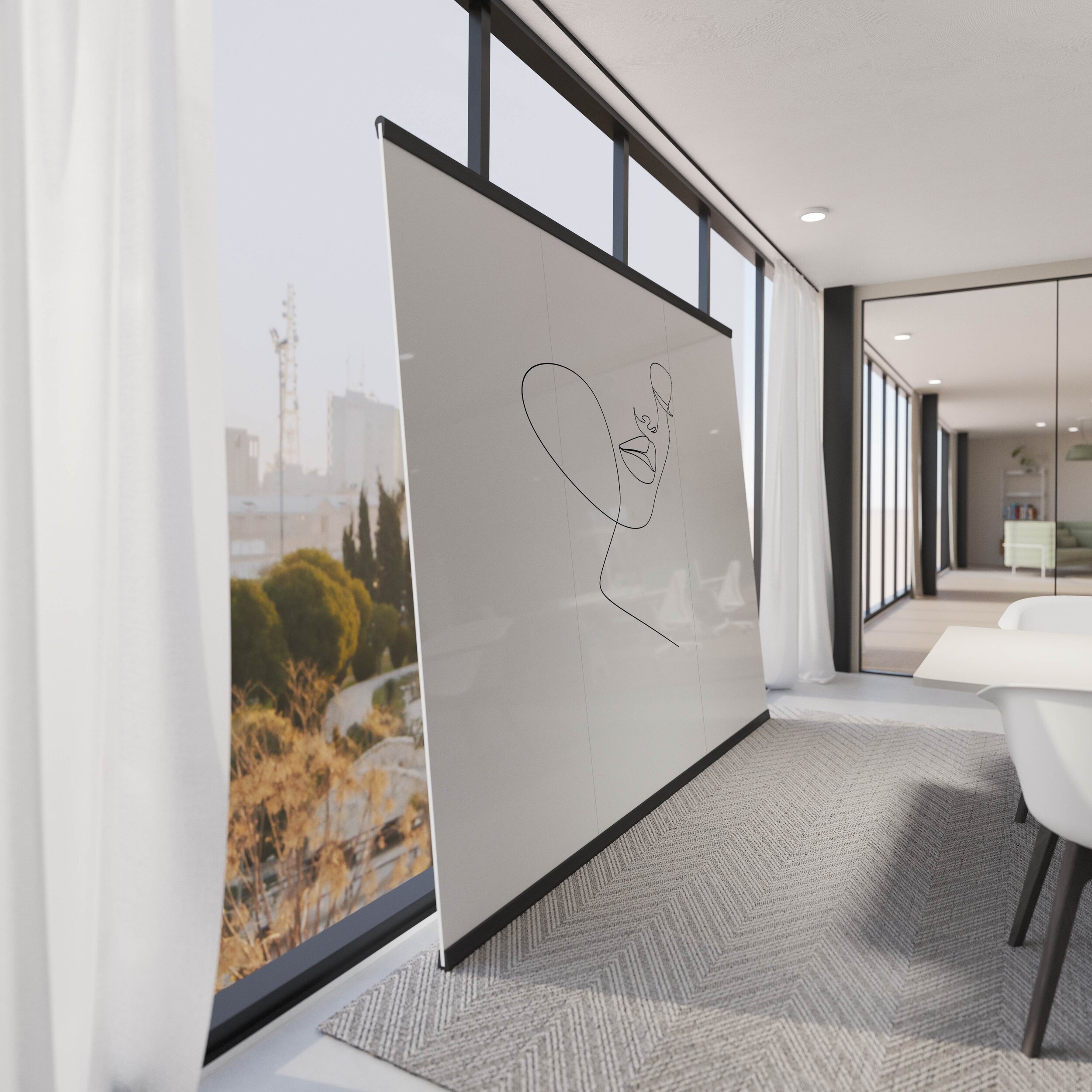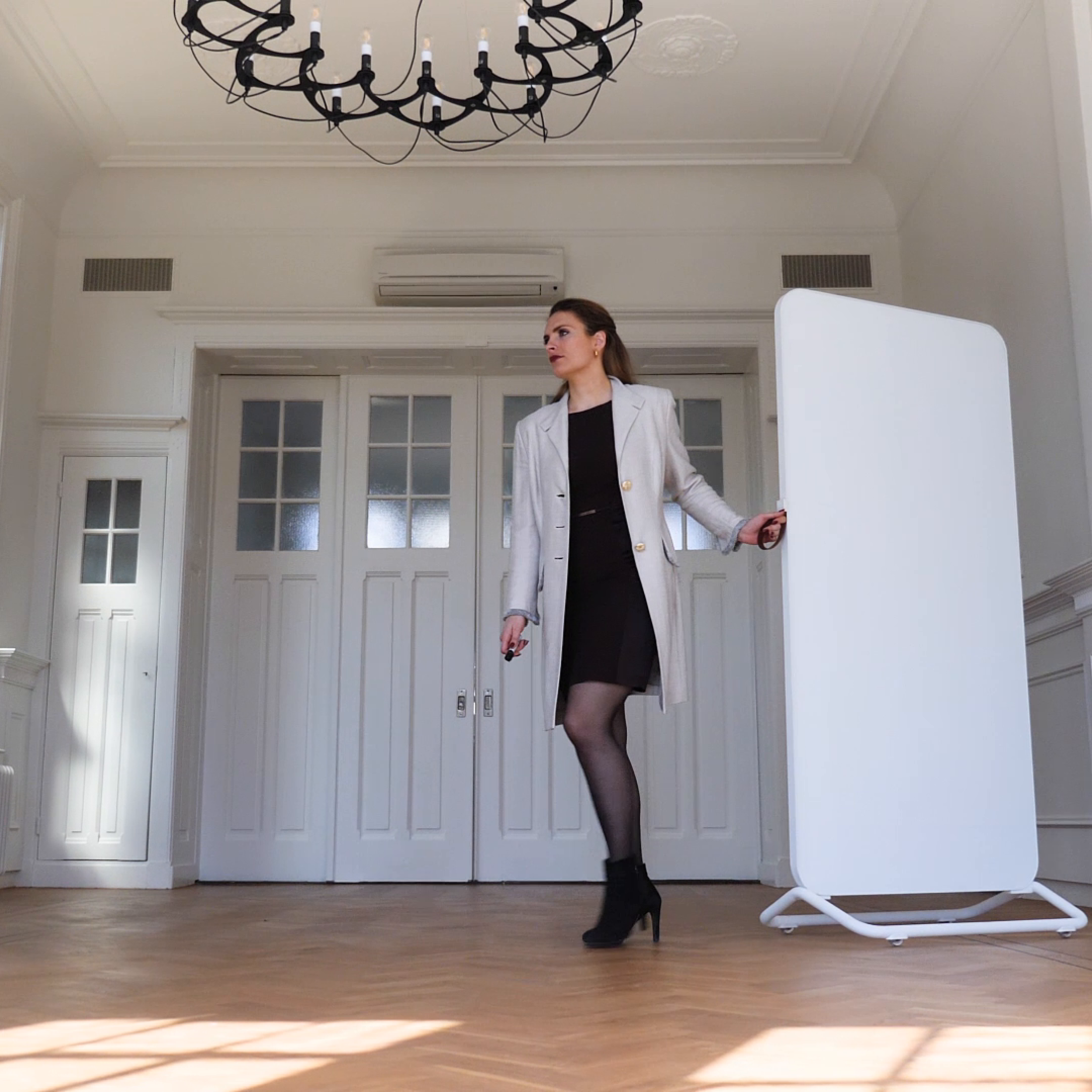 Harmonica Workwall: Denk gross, weil es möglich ist! Die 3-teilige Version dieser mobilen Ausklappwand bietet eine Schreibfläche von beeindruckenden 3,5 Metern Breite. Auf jeder Seite können 2 Paneele (Vorder- und Rückseite) platziert werden, und Sie haben die Wahl.