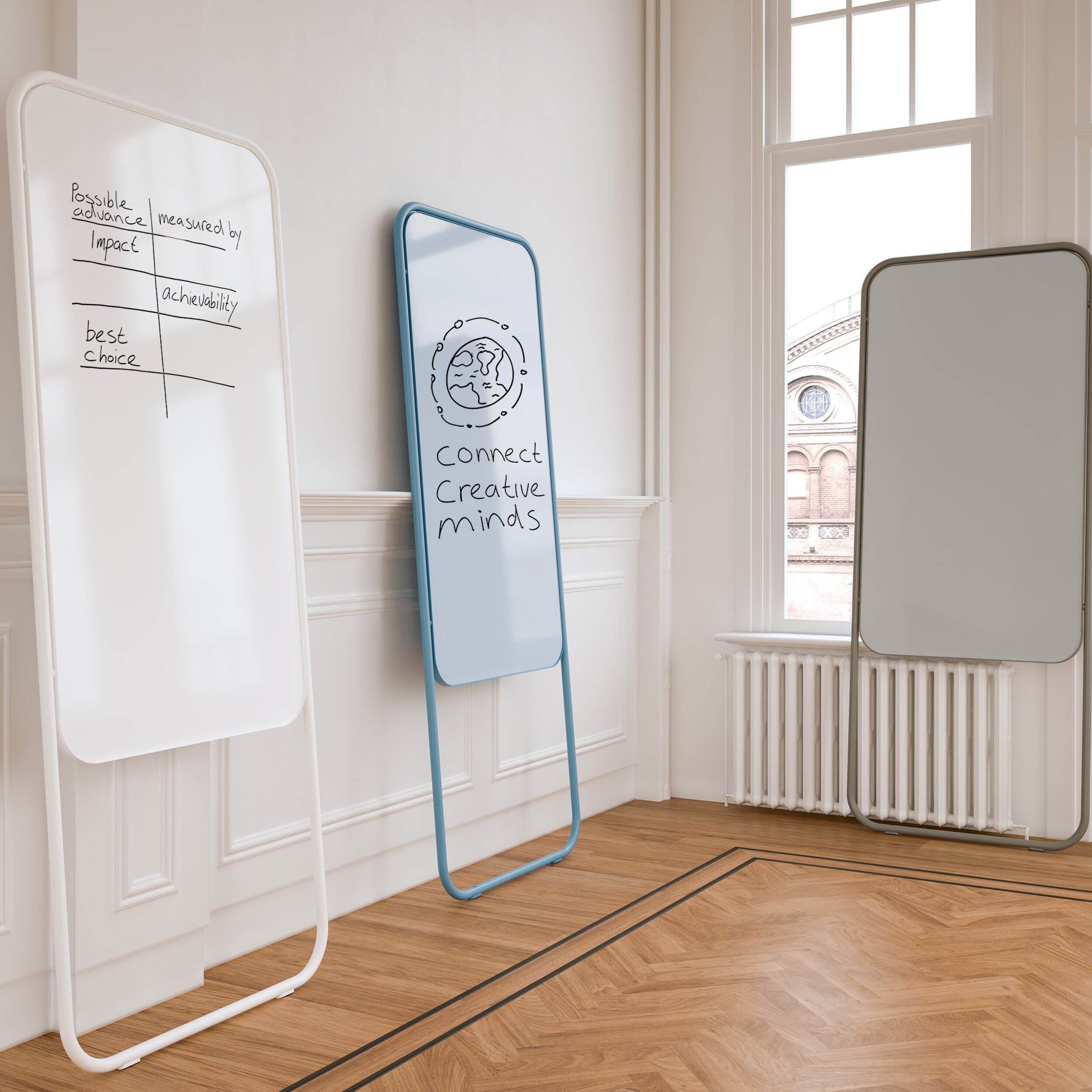 Mobile: Mobile Whiteboards tragen zu einer dynamischen Arbeitsumgebung bei. Sie fördern Zusammenarbeit und Interaktion. Chameleon Mobile wurde aus einem minimalistischen Blickwinkel heraus entwickelt. Die ästhetisch eleganten Rollen sind im Rahmen versenkt und ermöglichen es dem Whiteboard, nur in eine Richtung zu fahren (anstelle von schwenkbaren Rollen). Dadurch steht der Rahmen während des Schreibens besonders stabil.