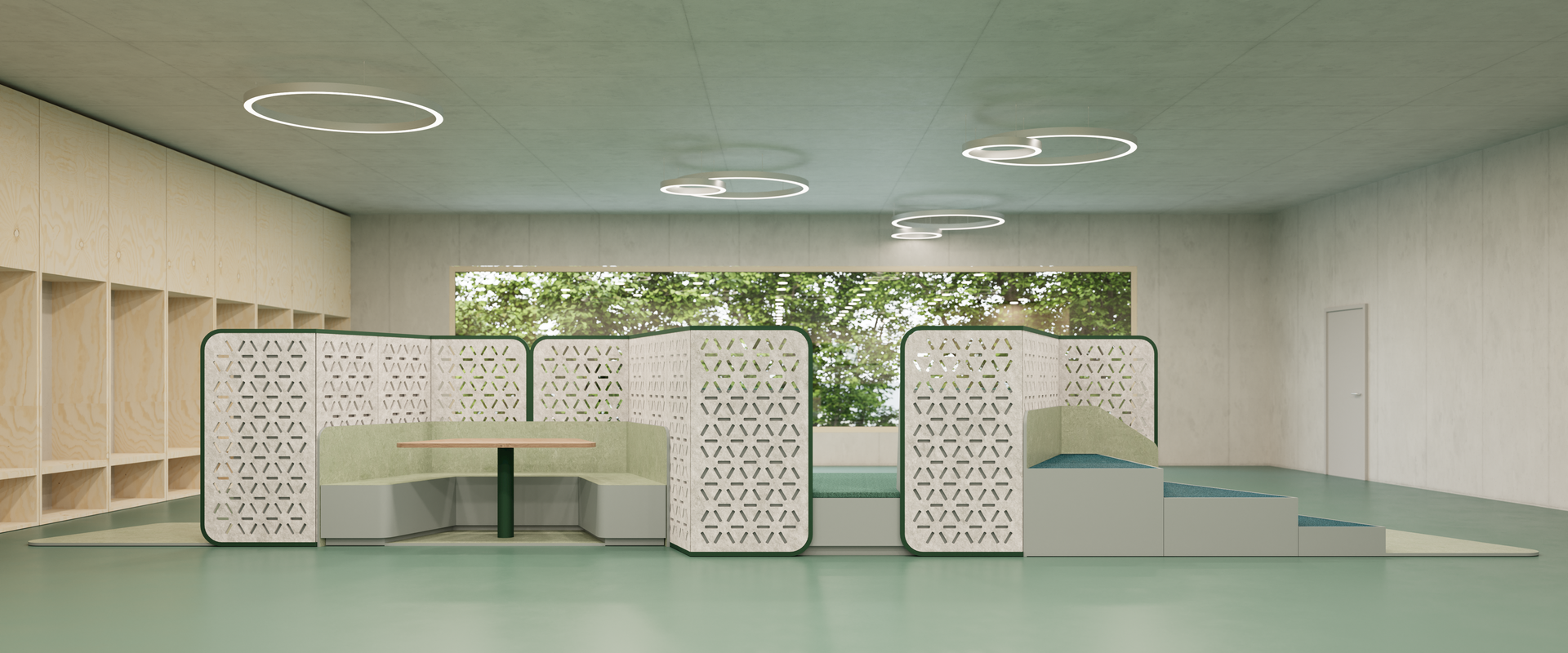 Notre îlot d'apprentissage offre, grâce à son plan articulé, des zones extraverties et protégées avec différentes fonctions. Les modules et les zones de séjour délimités par des éléments muraux permettent une grande diversité spatiale sur une surface réduite, ce qui fait de LERNINSEL l'univers d'apprentissage idéal pour les zones de couloir. LERNINSEL a été développé en collaboration avec ZMIK, Studio für Spatial Design.